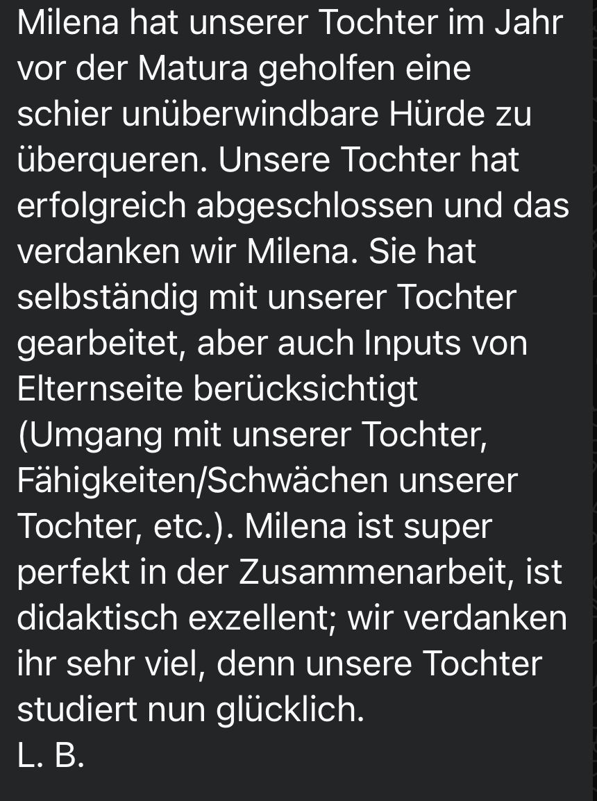 Milena ist eine erfahrene Lehrkraft mit Fokus auf die gezielte Vorbereitung für die Berufsreifeprüfung (BRP) und die AHS-Matura.